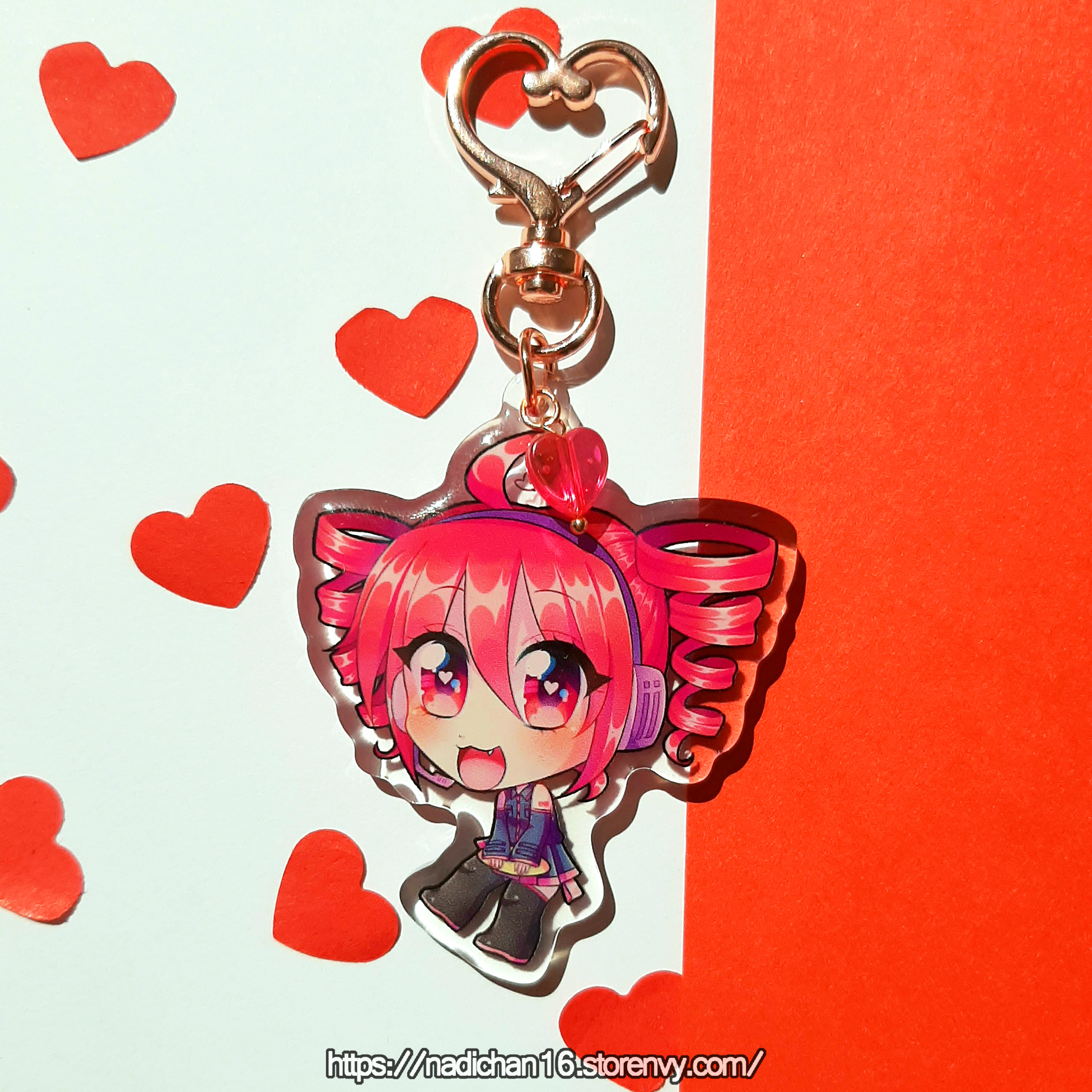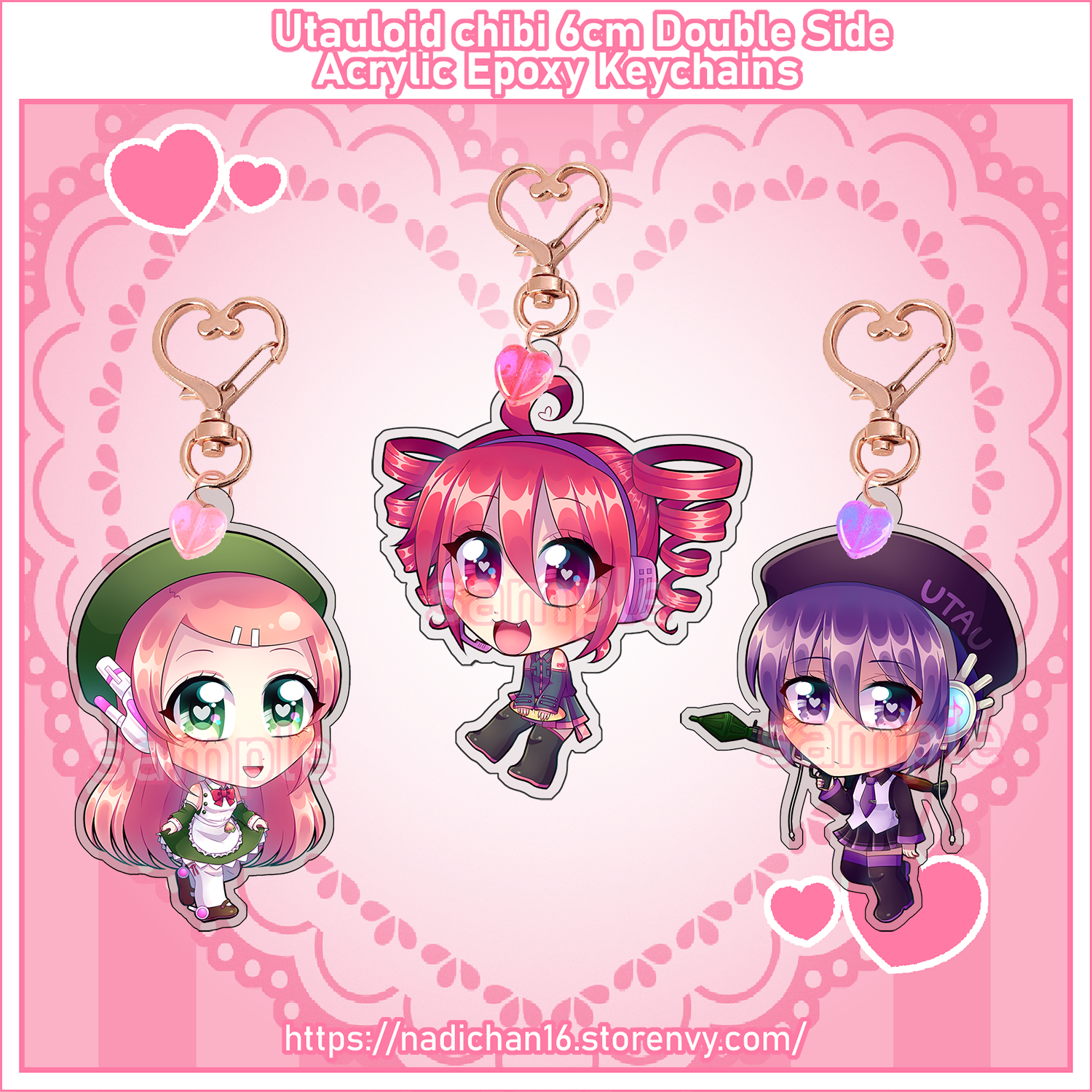 Utauloid Kasane Teto, Defoko and Momone Momo chibi 6cm/2.35inch Epoxy Acrylic Keychain. Double side printed. Each keychain comes with a rose-gold heart key ring and a small holographic heart charm.