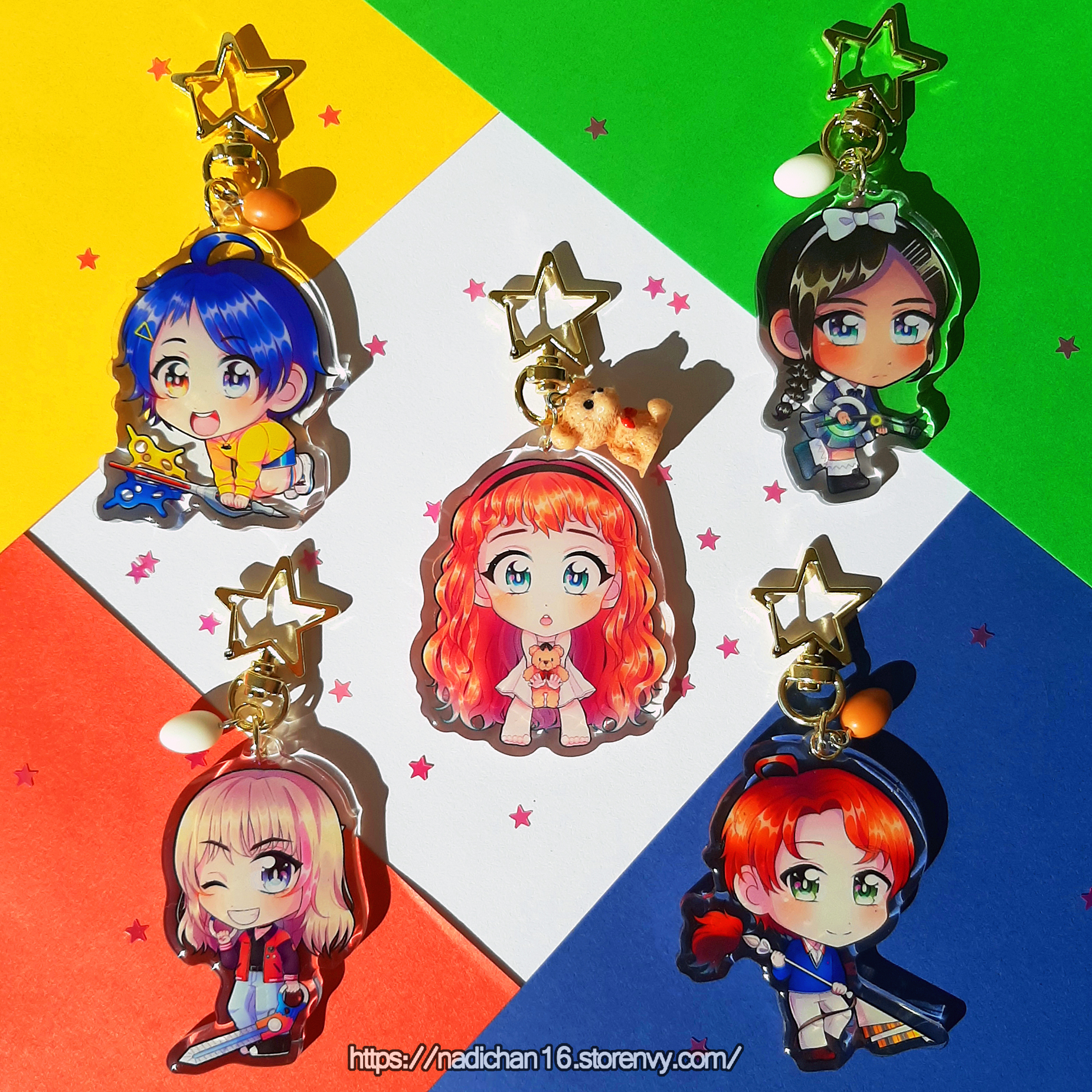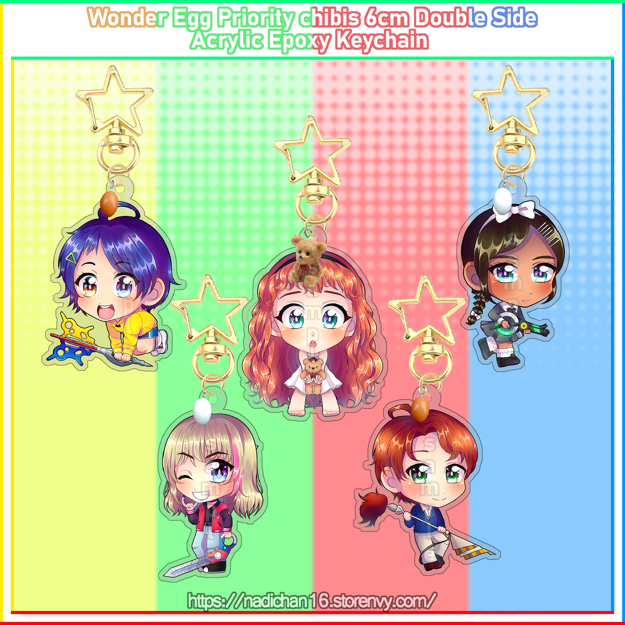 Wonder Egg Priority Ohto Ai, Neiru Aonuma, Rika Kawai, Momoe Sawaki and Frill chibis. 6cm/2.35inch Epoxy Acrylic Keychains. Double side printed. Each keychain comes with a golden star key ring and a random egg charm (Ohto Ai, Neiru Aonuma, Rika Kawai and Momoe Sawaki) or teddy bear charm (Frill).