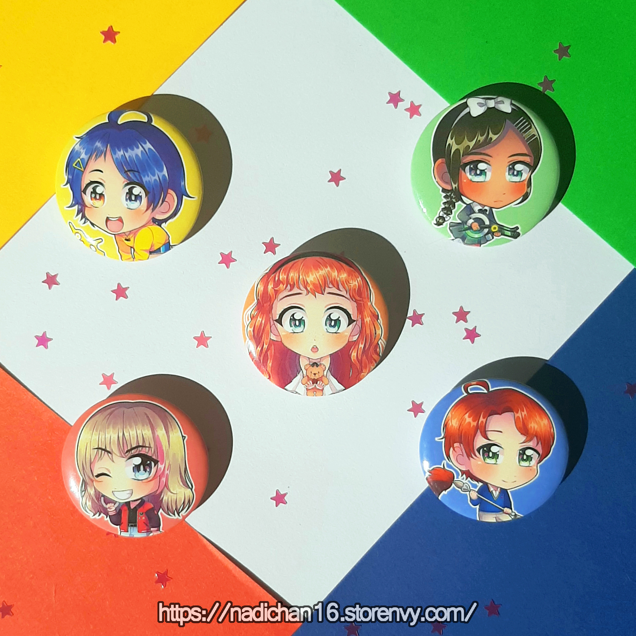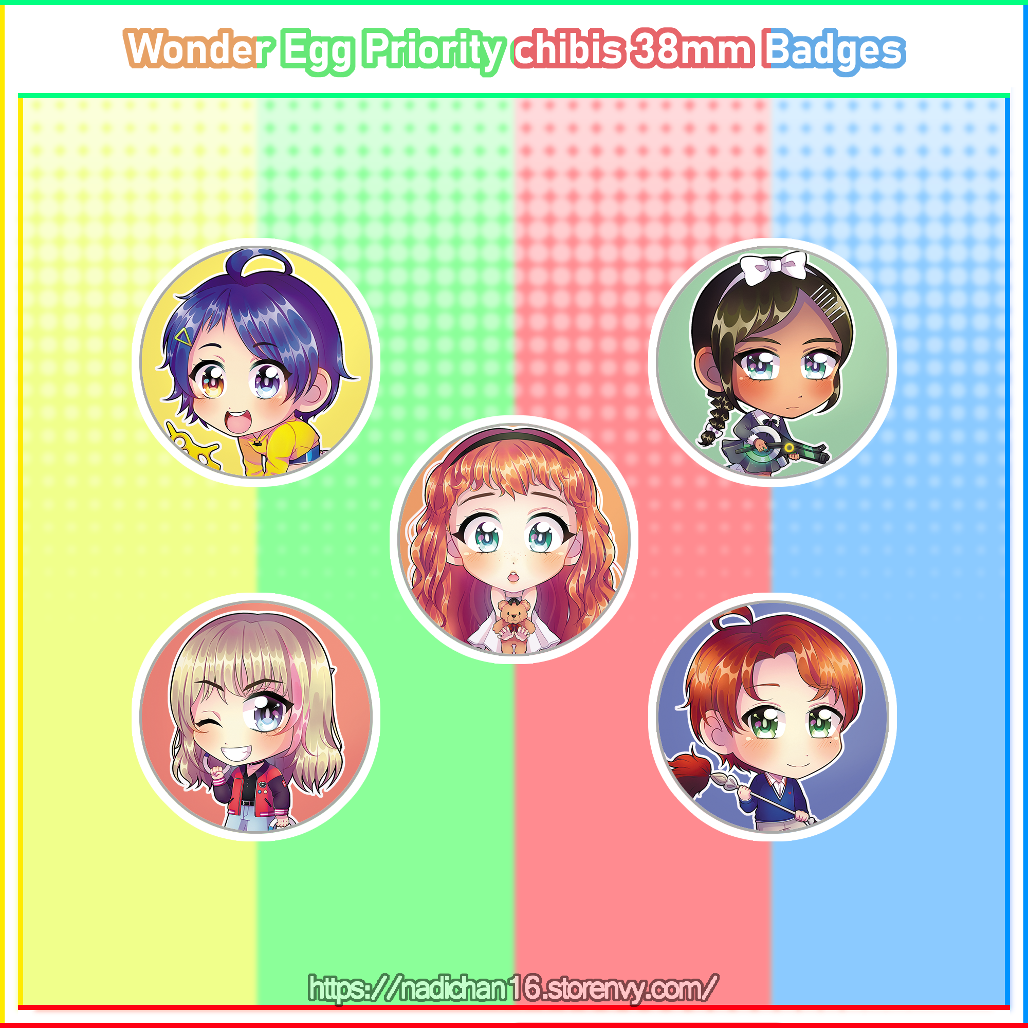 Wonder Egg Priority Ohto Ai, Neiru Aonuma, Rika Kawai, Momoe Sawaki and Frill chibis 1.5'' / 38mm diameter circular badges / buttons.