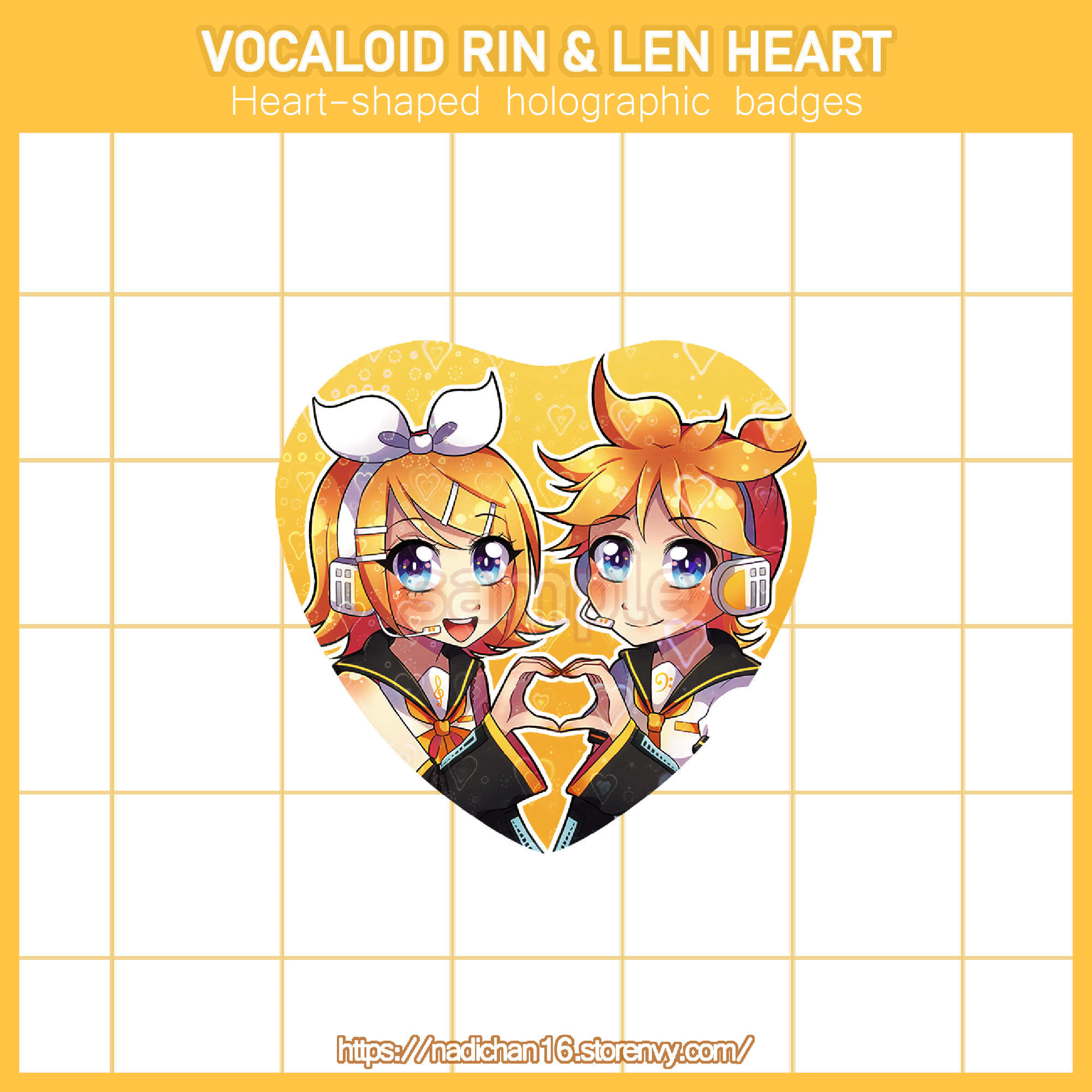 Vocaloid Rin & Len 5,3x5,7cm/2x2.25inch heart-shaped badge with holographic hearts film.
